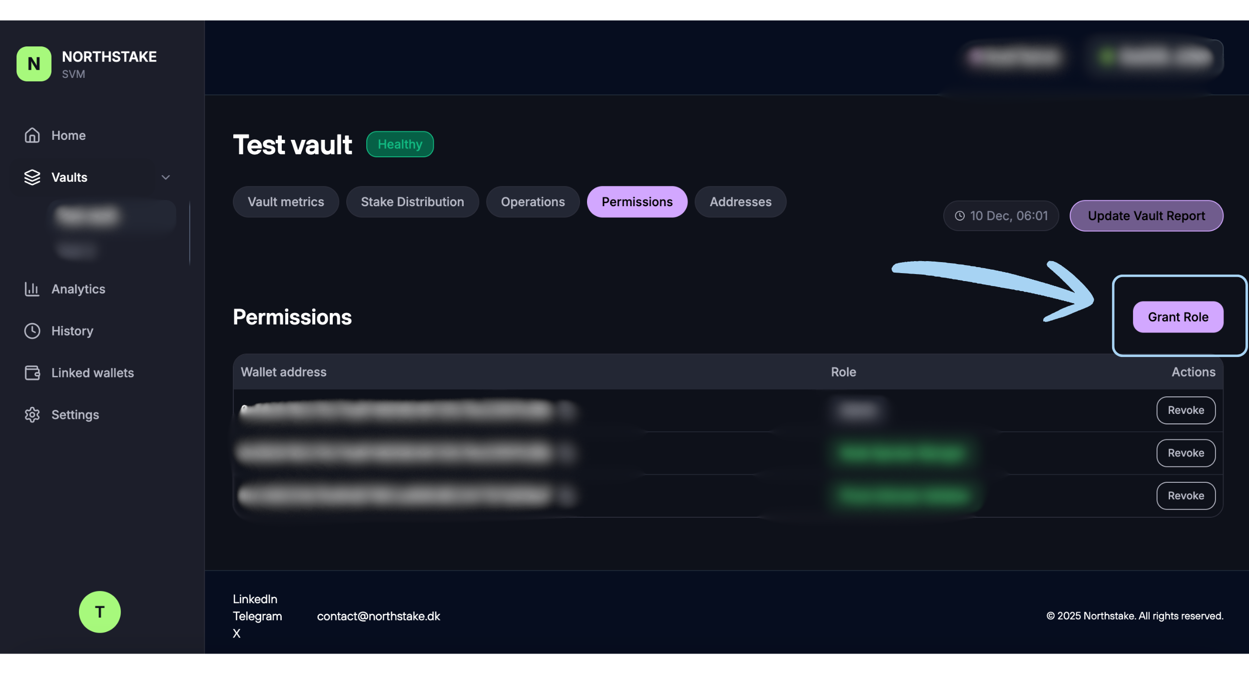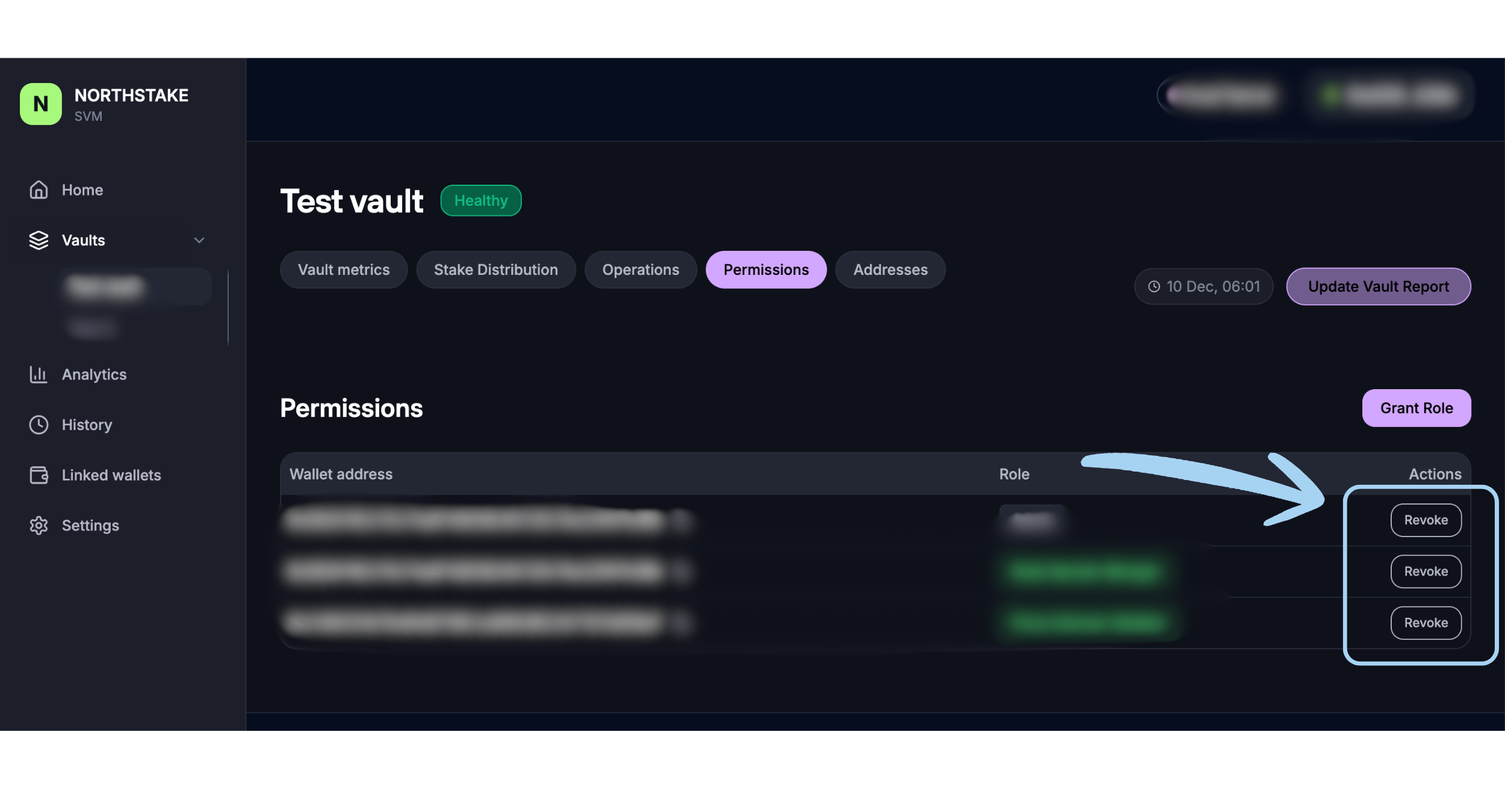In the vault overview, the Permissions pane displays all addresses associated with the vault along with their assigned roles. - Initiate Revocation